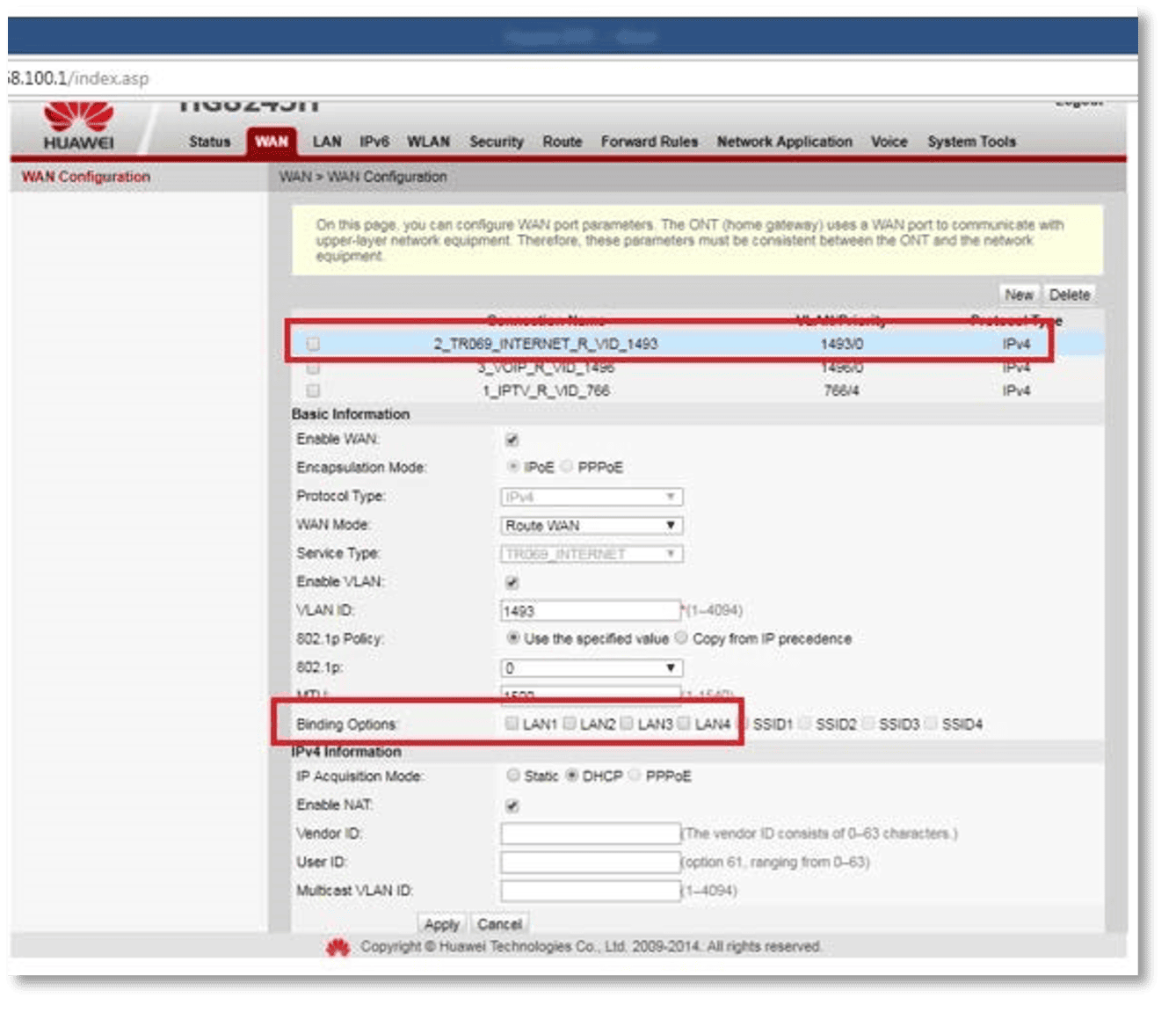 Pilih tab WAN, klik VLAN internet (seperti gambar di bawah). Klik port LAN1 sampai 4, lalu apply.