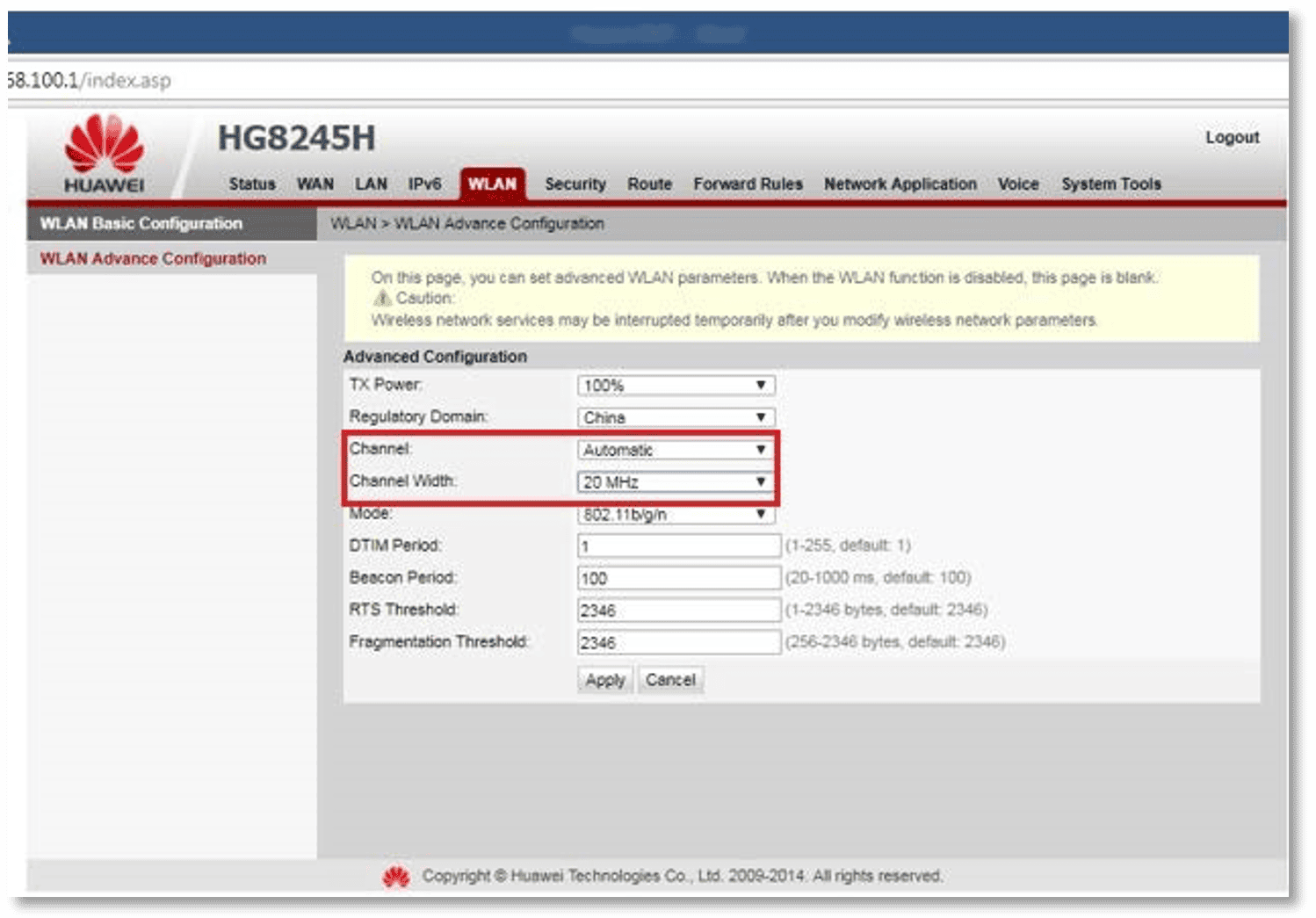Pilih tab WLAN >WLAN Advanced Configuration. Ganti Frequency (channel) ke nomor lain, misal ke channel 6. Selain itu, coba besarkan bandwidth WiFi dari 20Mhz ke 40Mhz.