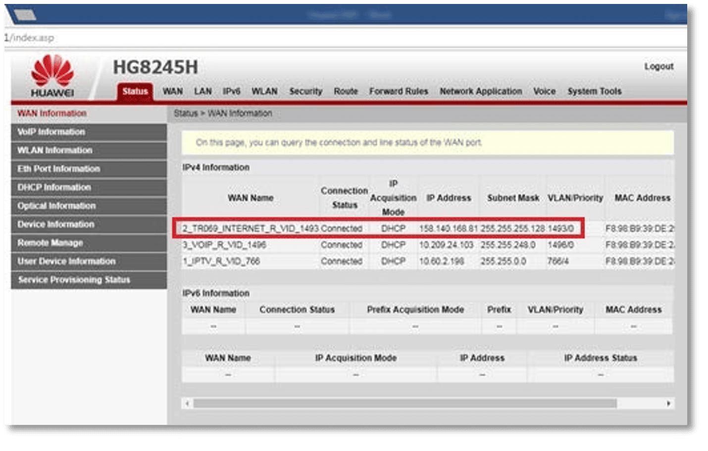 Cek apakah ONT mendapatkan IP di VLAN tersebut sesuai dengan gambar di atas. Apabila IP kosong, maka coba restart perangkat ONT anda (bisa dilakukan dengan menekan tombol power).