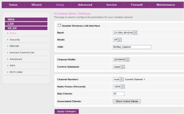 Pilih Menu Setup -> WLAN -> Basic untuk pengaturan SSID Kemudian Apply Changes