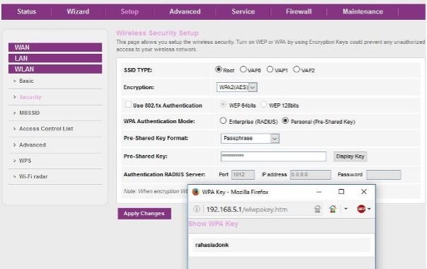 Pilih Menu Setup -> WLAN -> Security untuk pengaturan Password WIFI, kemudian Pilih Field Pre-Shared Key (Display Key) untuk melihat Password WIFI yang sudah tersetting sebelumnya, Kemudian Apply Changes