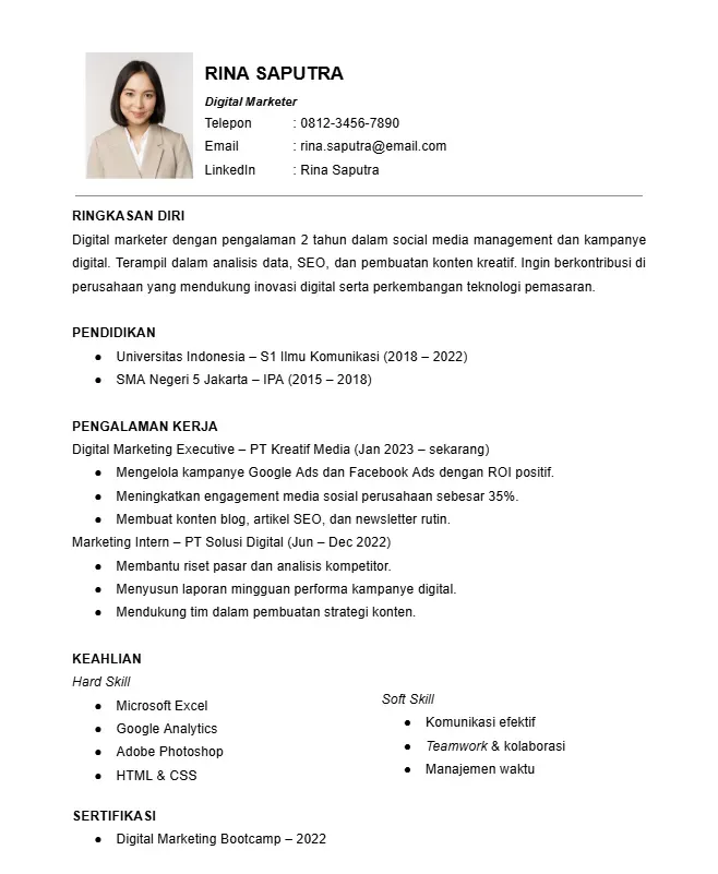 Berikut adalah hasil contoh CV lamaran kerja yang dibuat berdasarkan panduan cara membuat CV tadi. Bisa kamu jadikan sebagai acuan untuk membuat CV nanti.