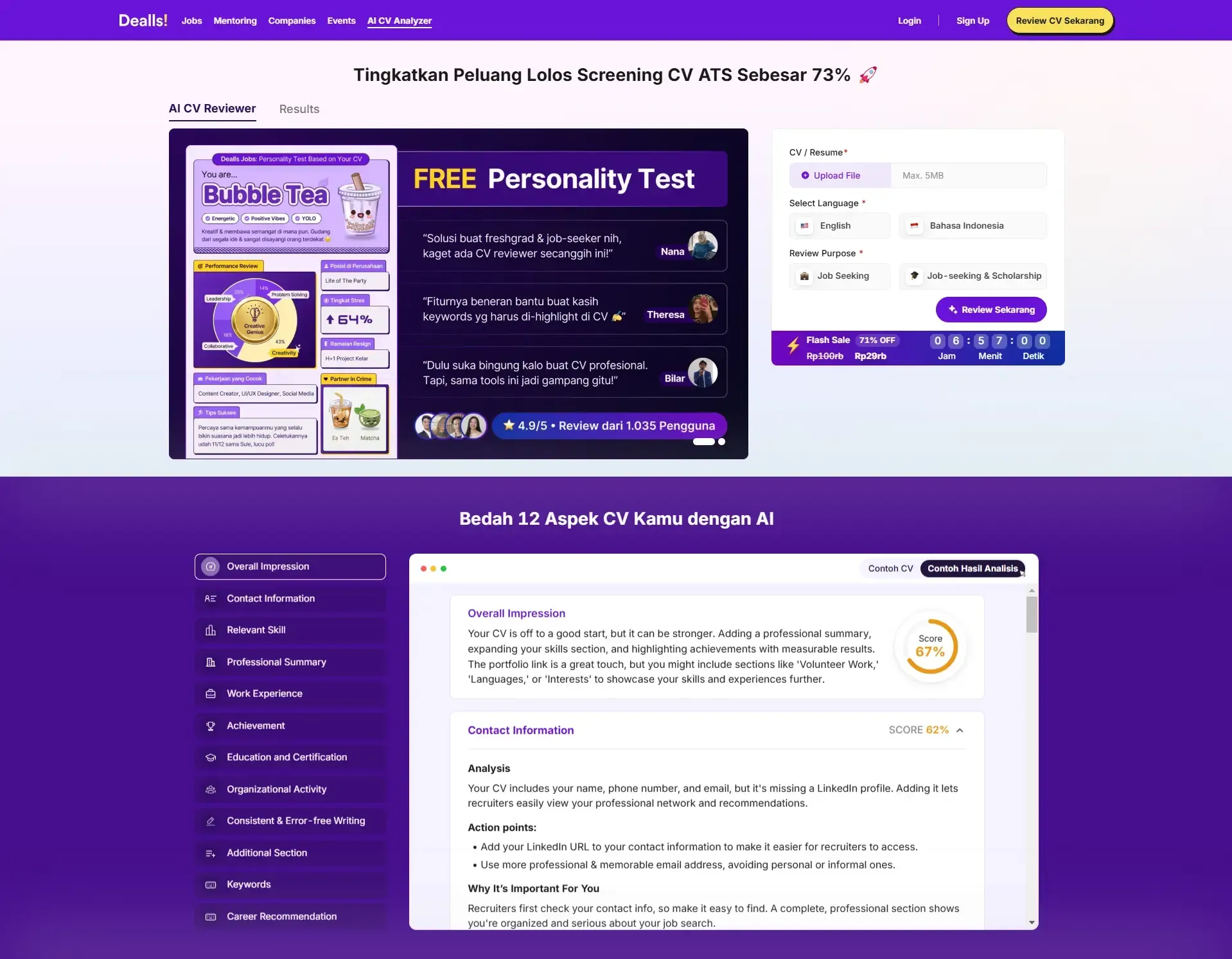 Sebelum mengirim, cek CV kamu pakai AI CV Reviewer gratis dari Dealls untuk memeriksa apakah CV-mu sudah terbaca ATS dan kata kunci sesuai dengan job desc.