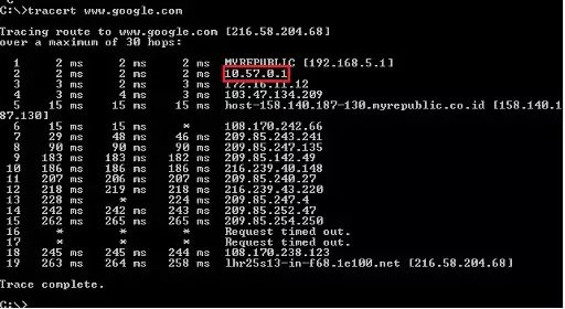 Pastikan default gateway anda muncul di salah satu hop awal (pada gambar di atas, default gateway 10.57.0.1 muncul di hop kedua). Apabila IP default gateway tidak muncul, kemungkinan anda bukan terkoneksi dengan koneksi internet, tetapi menggunakan OTT untuk TV.