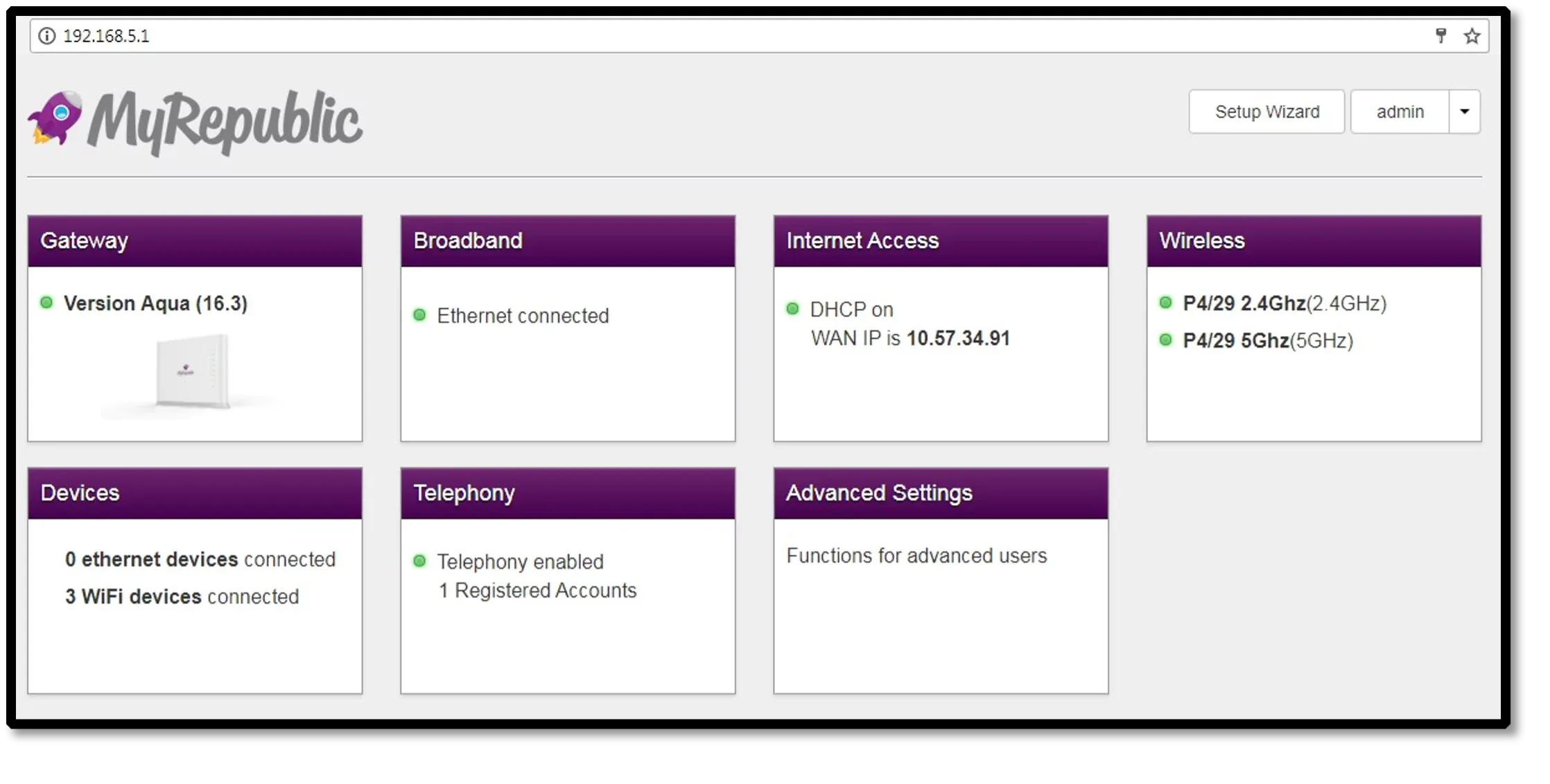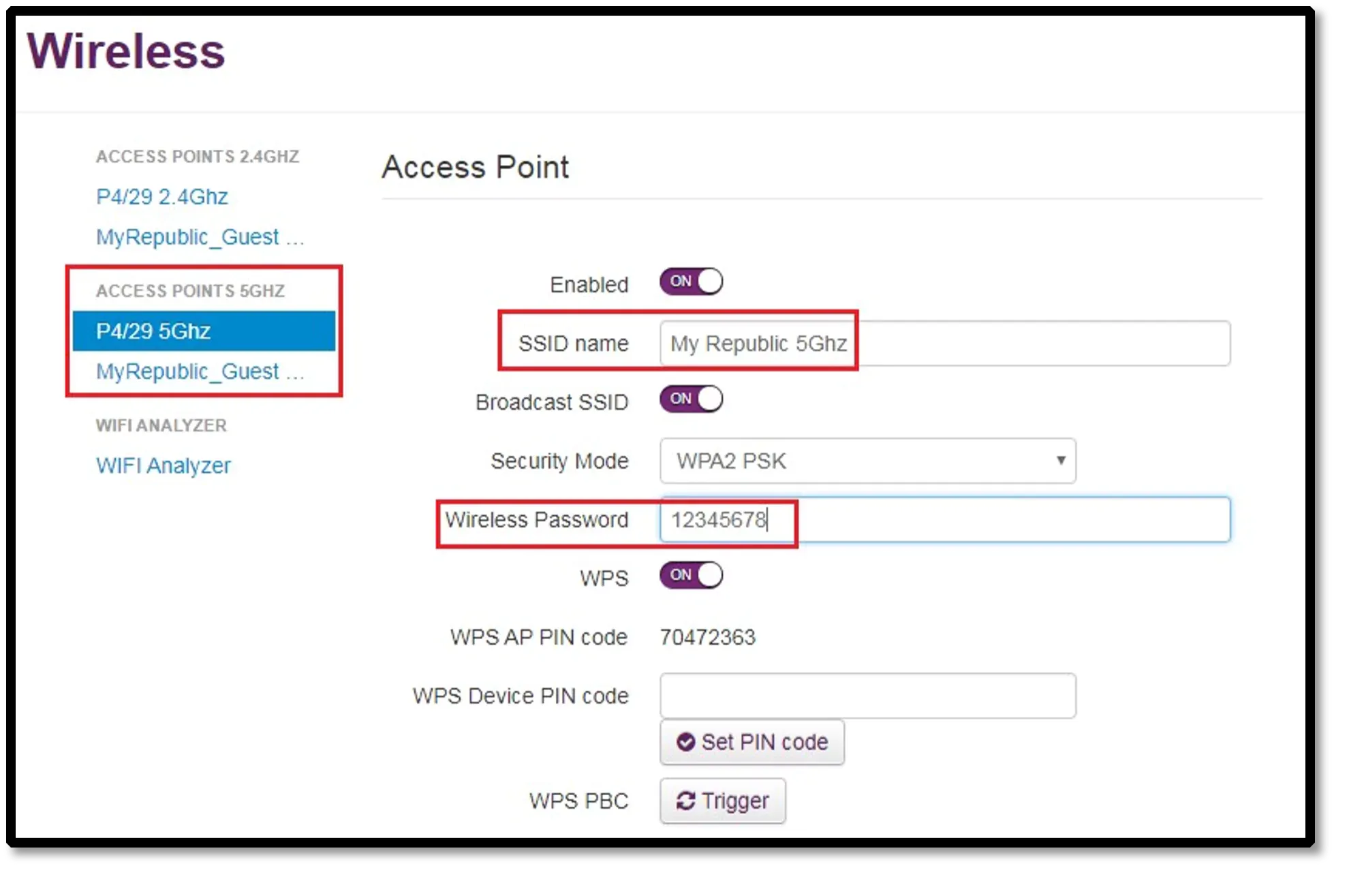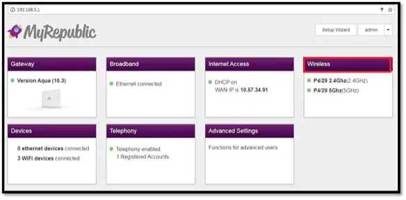 Perlu diketahui bahwa WiFi Hub anda telah support Wireless di 5Ghz yang memiliki tingkat interferensi lebih rendah. Untuk kenyamanan anda, silahkan bedakan SSID antara yang biasa (2.4Ghz) dengan yang 5Ghz. Anda dapat memilih untuk menggunakan WiFi 5.4Ghz pada perangkat pribadi anda dengan cara memilih SSID yang beroperasi pada frekuensi 5Ghz. Untuk Mengubah setting di SSID 5.4Ghz, pilih bagian wireless 5Ghz. Hal ini dapat dilihat pada gambar di bawah: