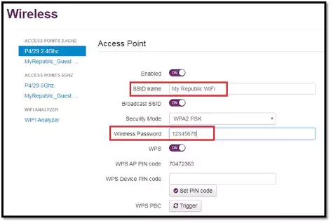 Untuk mengganti SSID WiFi, masukan WiFi SSID yang anda inginkan di bagian SSID name, dan passwordnya di Wireless password. SSID name adalah nama WiFi anda.