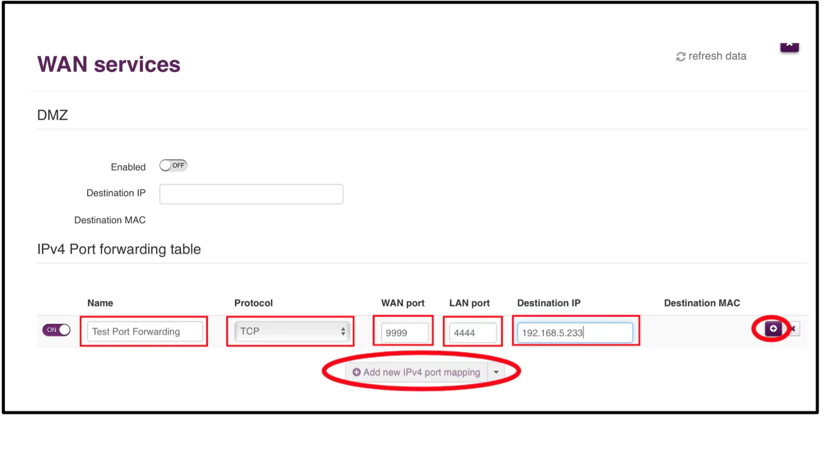 Klik “Add new Ipv4 port mapping”, lalu masukan nama, protocol, WAN port, LAN port, dan Destination IP (IP LAN perangkat, bagian dari 192.168.5.x) lalu klik +
