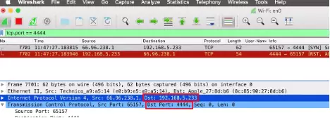 Cek menggunakan wireshark. Bisa dilihat bahwa ada paket dari IP public 66.96.238.1 ke 192.168.5.233 di port 4444. Dengan demikian port forwarding telah sukses.