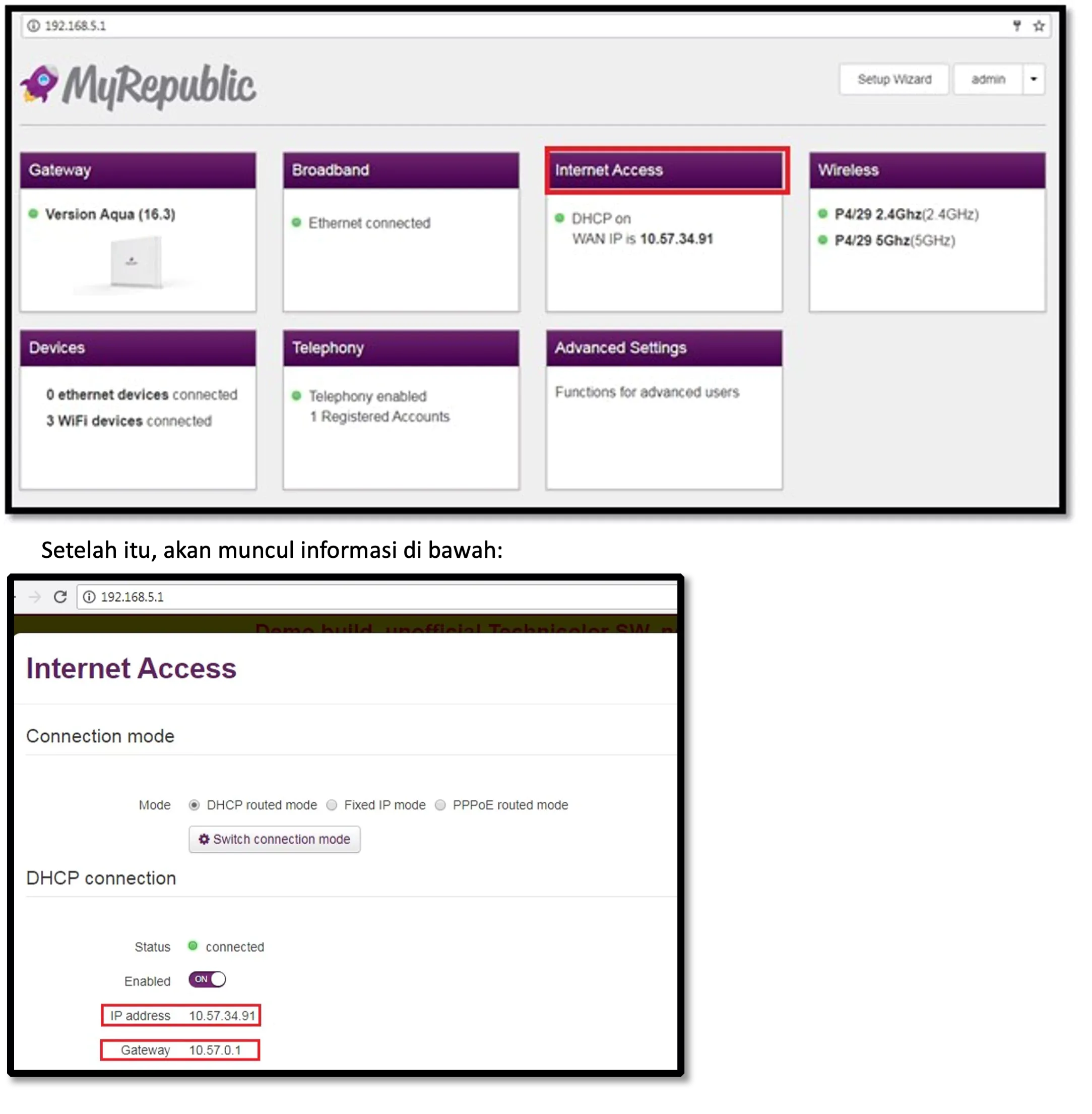 IP ada di halaman utama, namun apabila ingin melihat lebih detail, silahkan klik tab Internet Access, seperti pada gambar berikut: