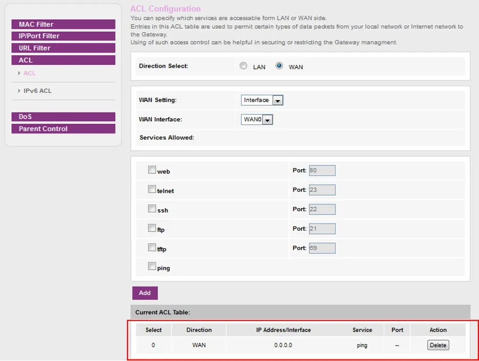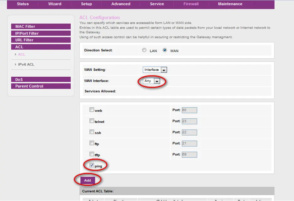 Maka akan Muncul Ketereangan sesuai Gambar yang di lingkari tanda merah, pada Table Current ACL Table. Dengan demikian maka Proses WAN PING ENABLE selesai.