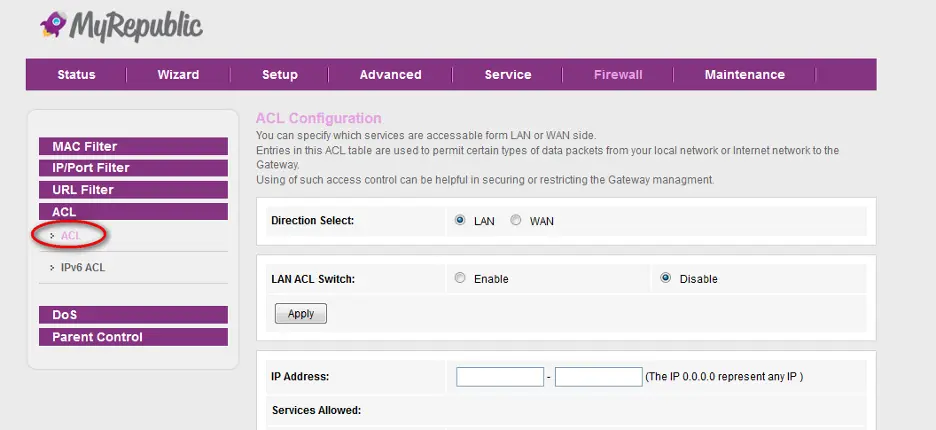 Setelah masuk ke Sub Tab ACL Pilih Option Button WAN sesuai pada gambar di bawah: