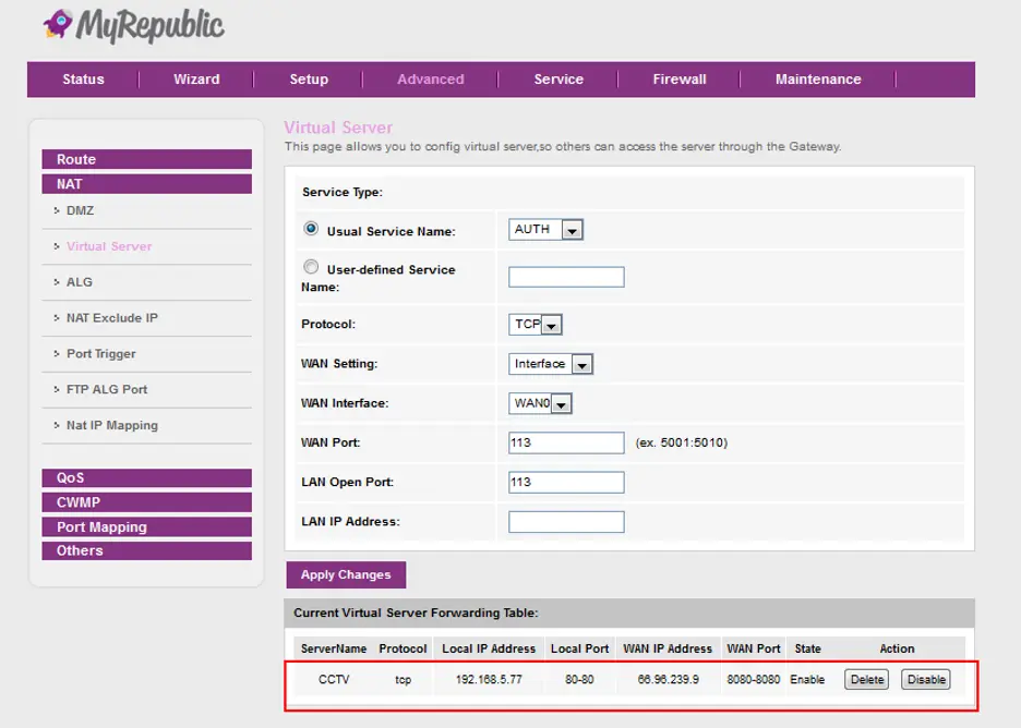 Akan muncul informasi pada Current virtual server forwarding Tabl, Dengan keterangan CCTV tadi yang kita buat, maka proses Port Forwarding telah selesai.