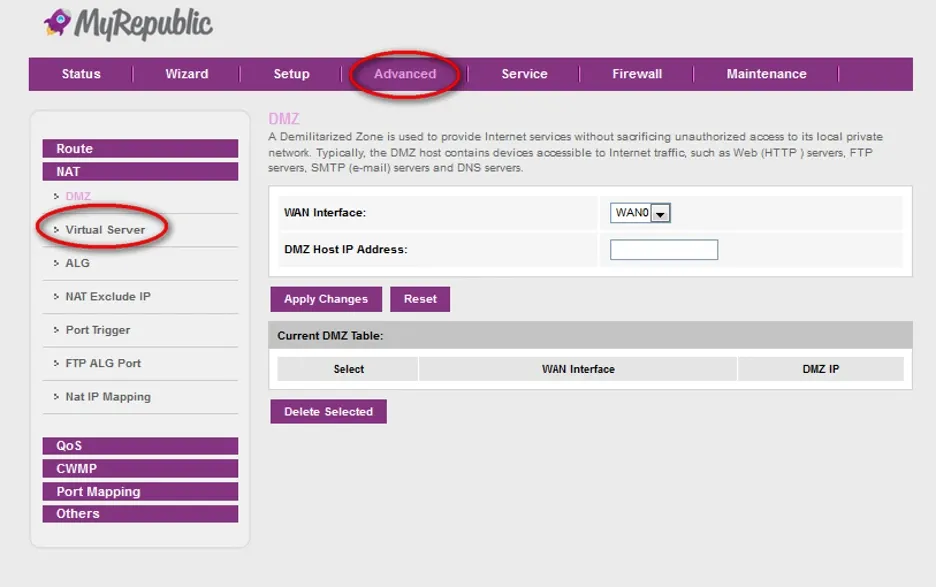 Untuk Port Forwarding pilih Tab Advance(Sesuai Lingkaran Merah), lalu pada Sub Tab-nya Klik NAT lalu pilih/ klik Virtual Server(Sesuai Lingkaran Merah).