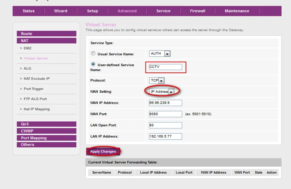 Setelah itu akan muncul Informasi sesuai gambar di bawah, Lalu pada Option Button pilih/ klik User-defined Service. Kemudian Tulis CCTV. Setelahnya pilih/klik pada WAN Setting Drop Dwon List Button IP Address. Kemudian proses terakhir Klik Apply Changes untuk Save.