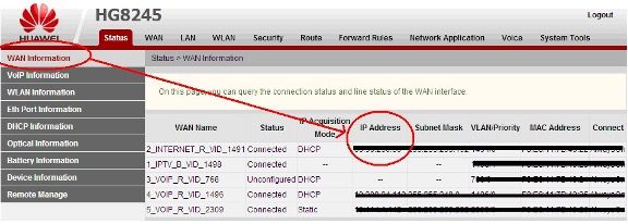 Pastikan Anda sudah menggunakan profile static dan mendapatkan IP static. Untuk melihat informasi tersebut pilih tab Status, kemudian masuk ke menu WAN Information, dan cek IP Address.